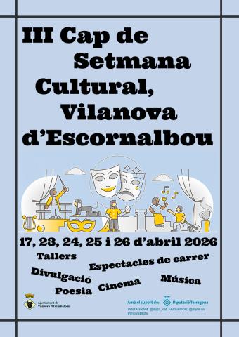 L’Ajuntament de Vilanova d’Escornalbou fa saber que, del 23 al 26 d’abril , tindrà lloc al nostre municipi la tercera edició del Cap de Setmana Cultural . Un any més, volem oferir a veïns i visitants un conjunt d’activitats que s’allunyen de les programacions habituals de festa major, posant la...