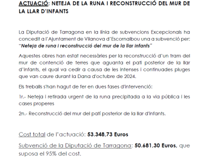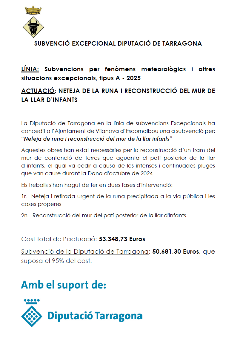 La Diputació de Tarragona en la línia de subvencions Excepcionals ha concedit a l’Ajuntament de Vilanova d’Escornalbou una a subvenció per: “Neteja de runa i reconstrucció del mur de la llar infants”